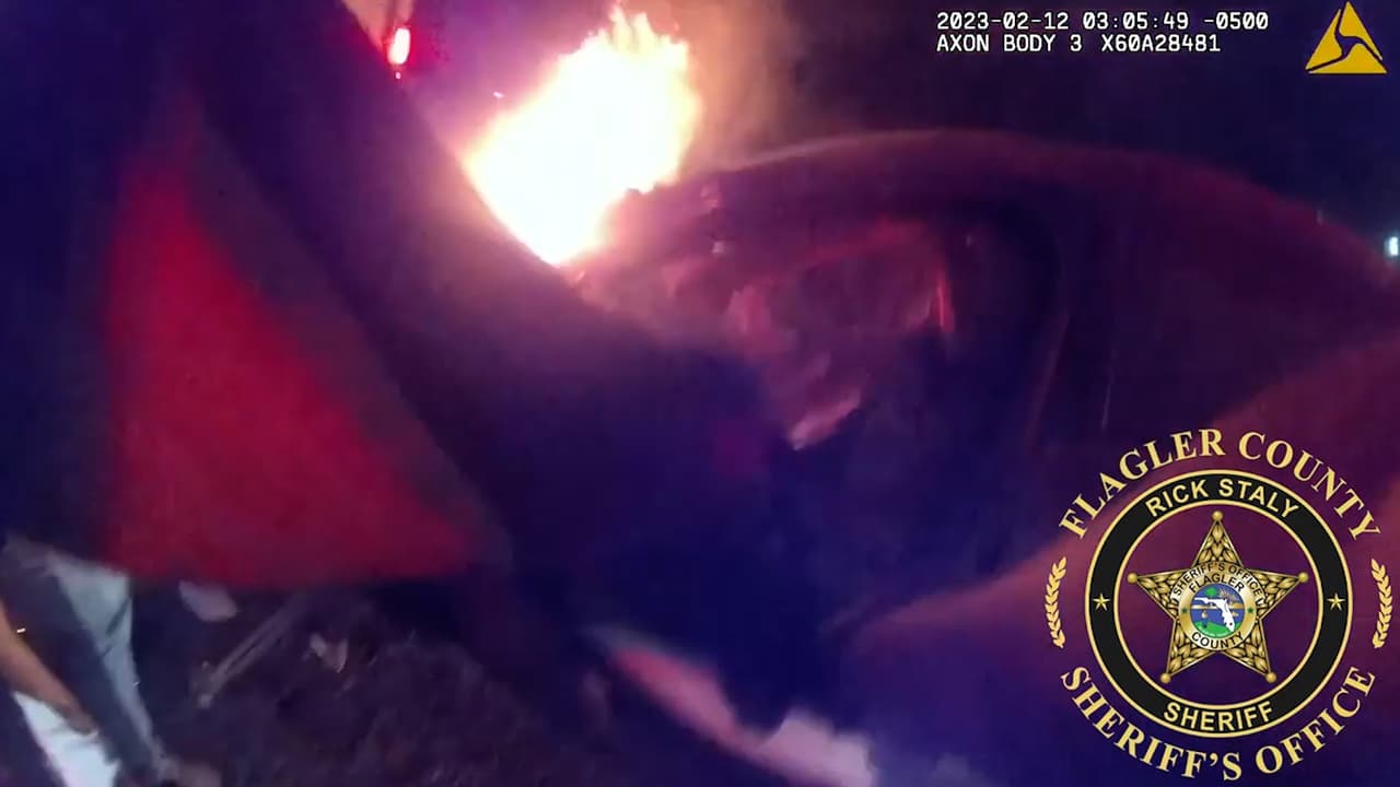 El cabo Barnett de la Oficina del Alguacil del condado Flagler usó un extintor de incendios para tratar de apagar el fuego que salía del capó del auto.