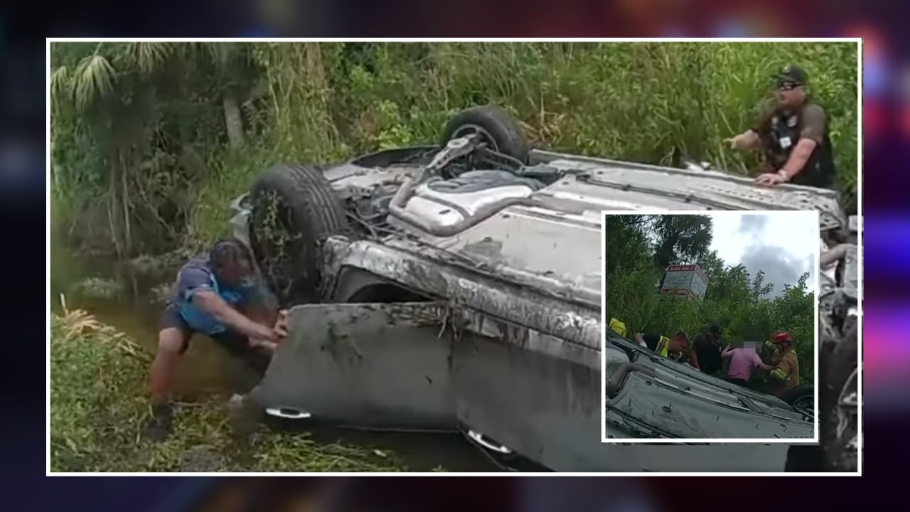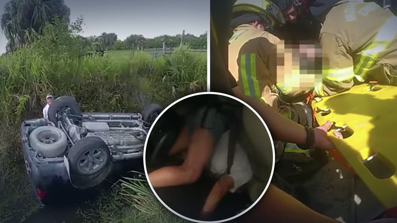 Un conductor fue rescatado tras quedar atrapado dentro de su auto en llamas, luego de un choque en Florida