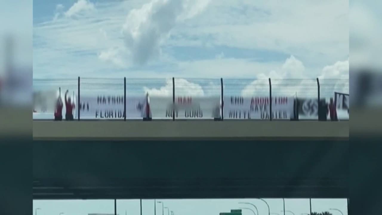Varias personas despliegan pancartas con mensajes de odio en un puente de la Conroy Road en Orlando