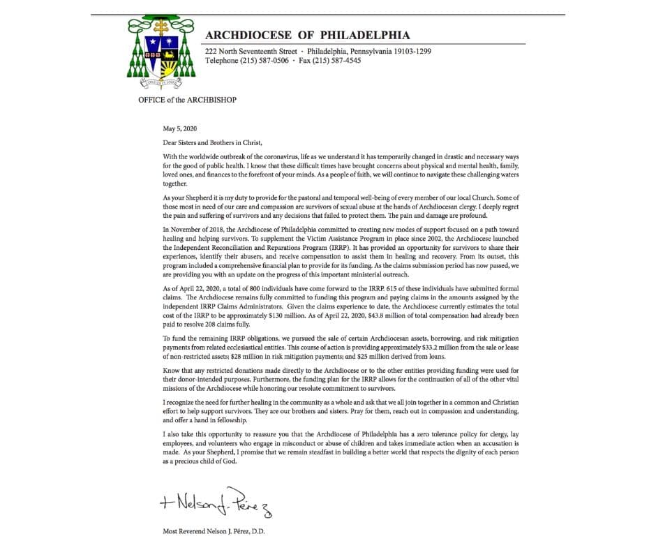 En la carta, el arzobispo expresa que la arquidiócesis sigue totalmente comprometida a financiar un programa de reparación para las víctimas y pagar reclamos por aproximadamente $ 130 millones, lo que se traduce a alrededor de $ 211,000 por reclamo.