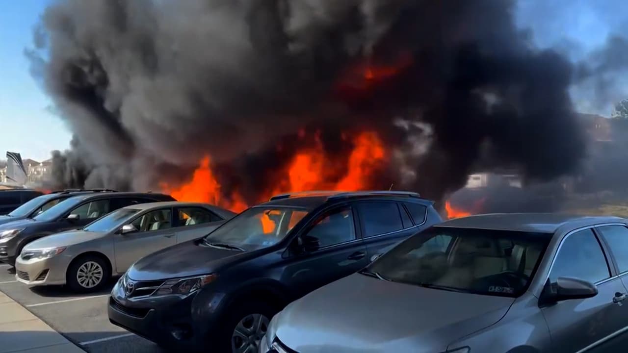 Una falla en la puerta de la aeronave provocó el accidente que terminó en una bola de fuego. Los cinco ocupantes fueron llevados a hospitales locales y la avioneta causó daños a 12 vehículos en el estacionamiento de una residencia geriátrica.