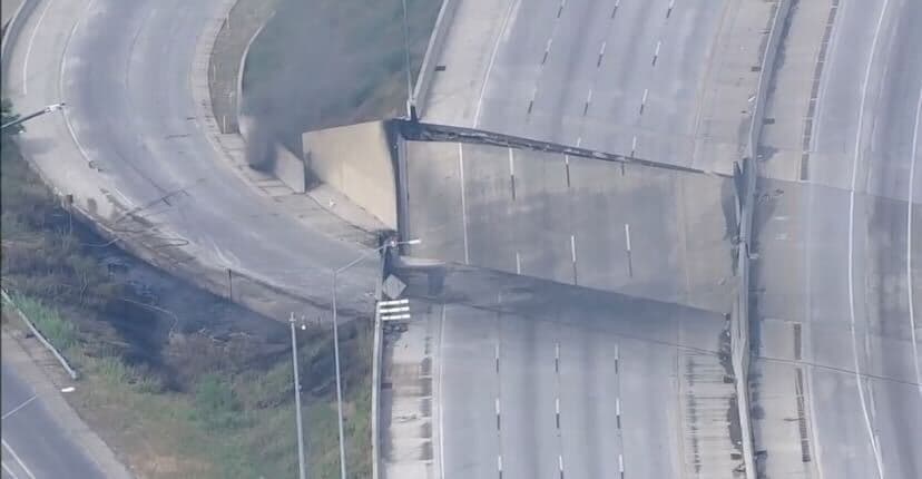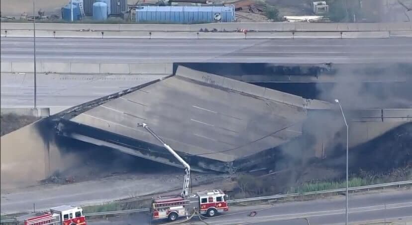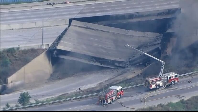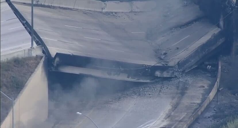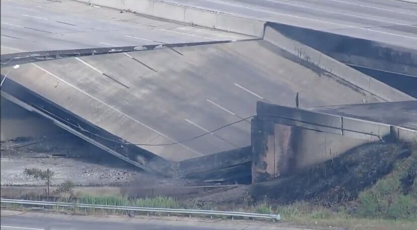 El incendio de un camión cisterna debajo de un paso elevado provocó el colapso de una parte de la Interestatal 95 la mañana del domingo.