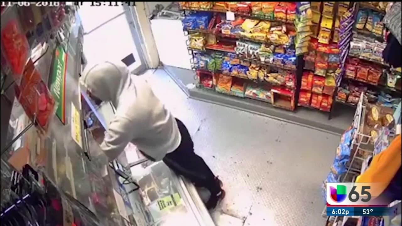 La policía busca al sospechoso del robo a una tienda y dio a conocer el video del suceso, para que la comunidad proporcione ayuda para capturarlo.