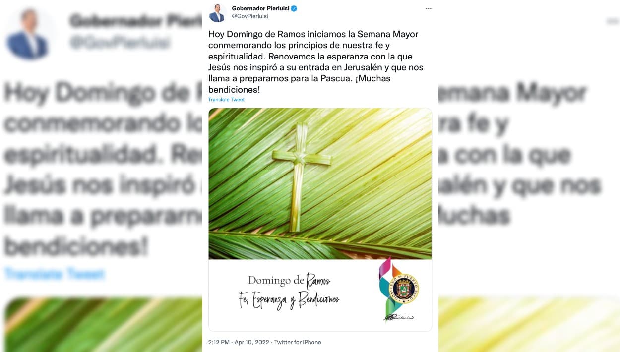 "Hoy Domingo de Ramos iniciamos la Semana Mayor conmemorando los principios de nuestra fe y espiritualidad. Renovemos la esperanza con la que Jesús nos inspiró a su entrada en Jerusalén y que nos llama a prepararnos para la Pascua", fue la invitación de Pierluisi, quien se identifica católico.