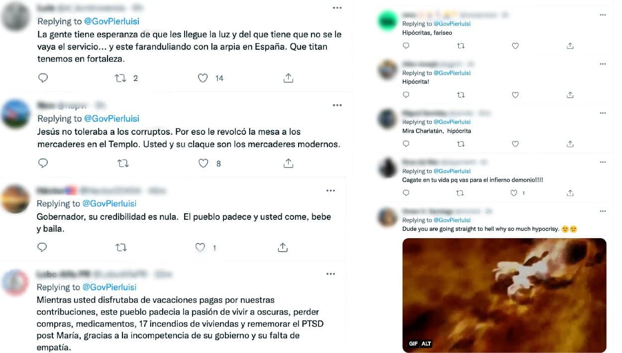 Aunque Pedro Pierluisi se mantuvo informando sobre las reuniones y presentaciones que hacían en España, buscando oportunidades empresariales, quienes lo siguen en Twitter le reclamaron que mientras el pueblo sufría por la falta de energía eléctrica, él comía, bailaba y dormía en un hotel, con aire acondicionado.