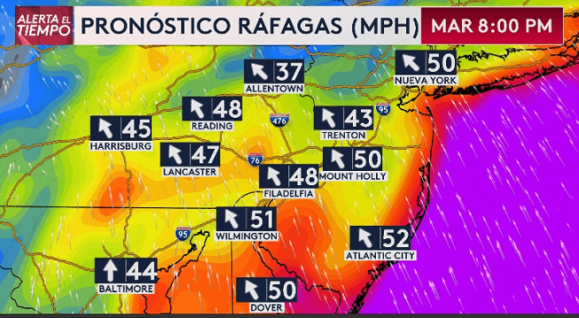 En cuanto a los vientos más dañinos, se esperaban en mayor medida en la costa de Jersey; sin embargo, las ráfagas de 50 millas por hora podrían extenderse hasta los suburbios de Pensilvania.