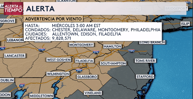 La tarde noche de este martes, la región de Filadelfia ha estado bajo lluvias torrenciales y fuertes vientos, con ráfagas de 45 a 65 millas por hora. Una Vigilancia por Inundación está activa, mientras ya hay reporte de inundaciones.