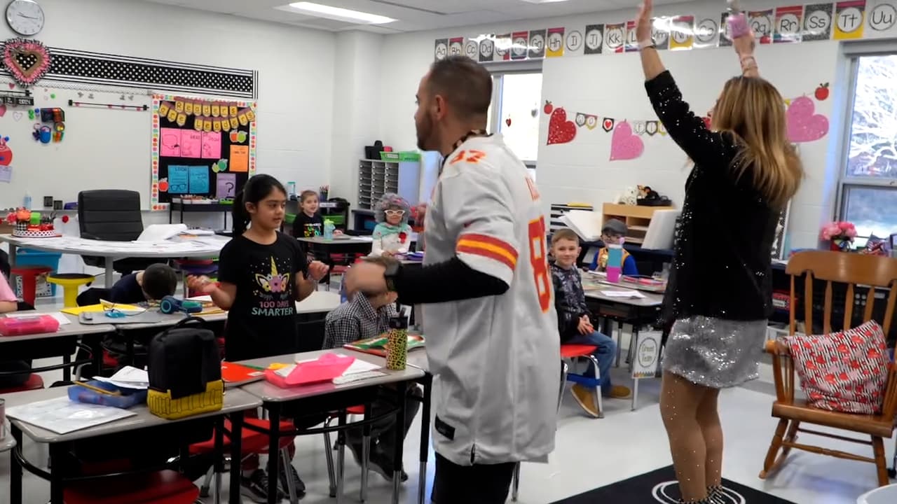 Alumnos del distrito escolar de South Park pudieron disfrutar de la visita de Taylor Swift y su novio Travis Kelce, con quienes bailaron, cantaron y disfrutaron. En realidad, se trató de los directores escolares Kelli Dellarose y Anthony Trozzi, quienes se caracterizaron como la famosa pareja para celebrar el día 100 de clases.