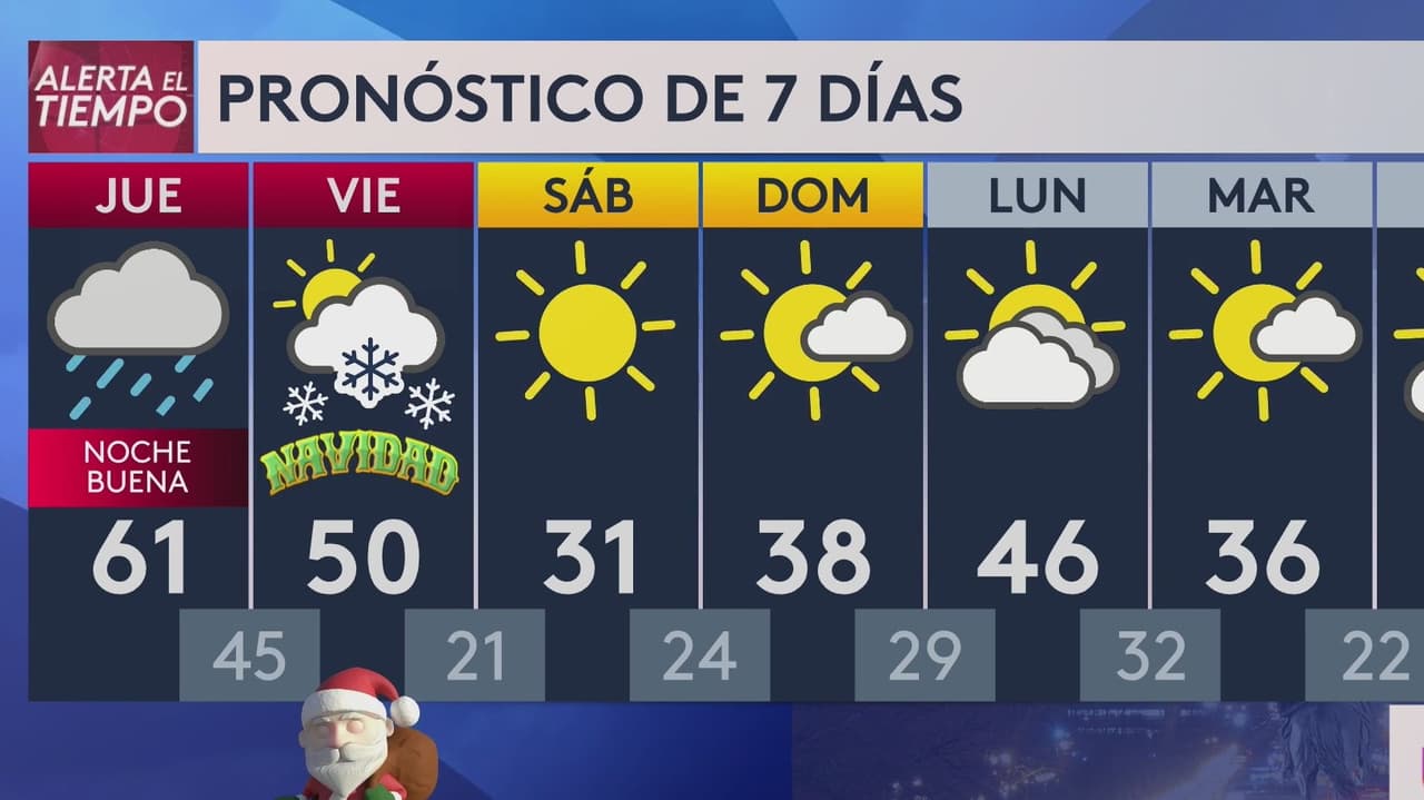 Día de Navidad: es posible que llueva antes de las 11 a.m. y que nieve después del mediodía. Las ráfagas de viento podrían alcanzar las 25 mph.