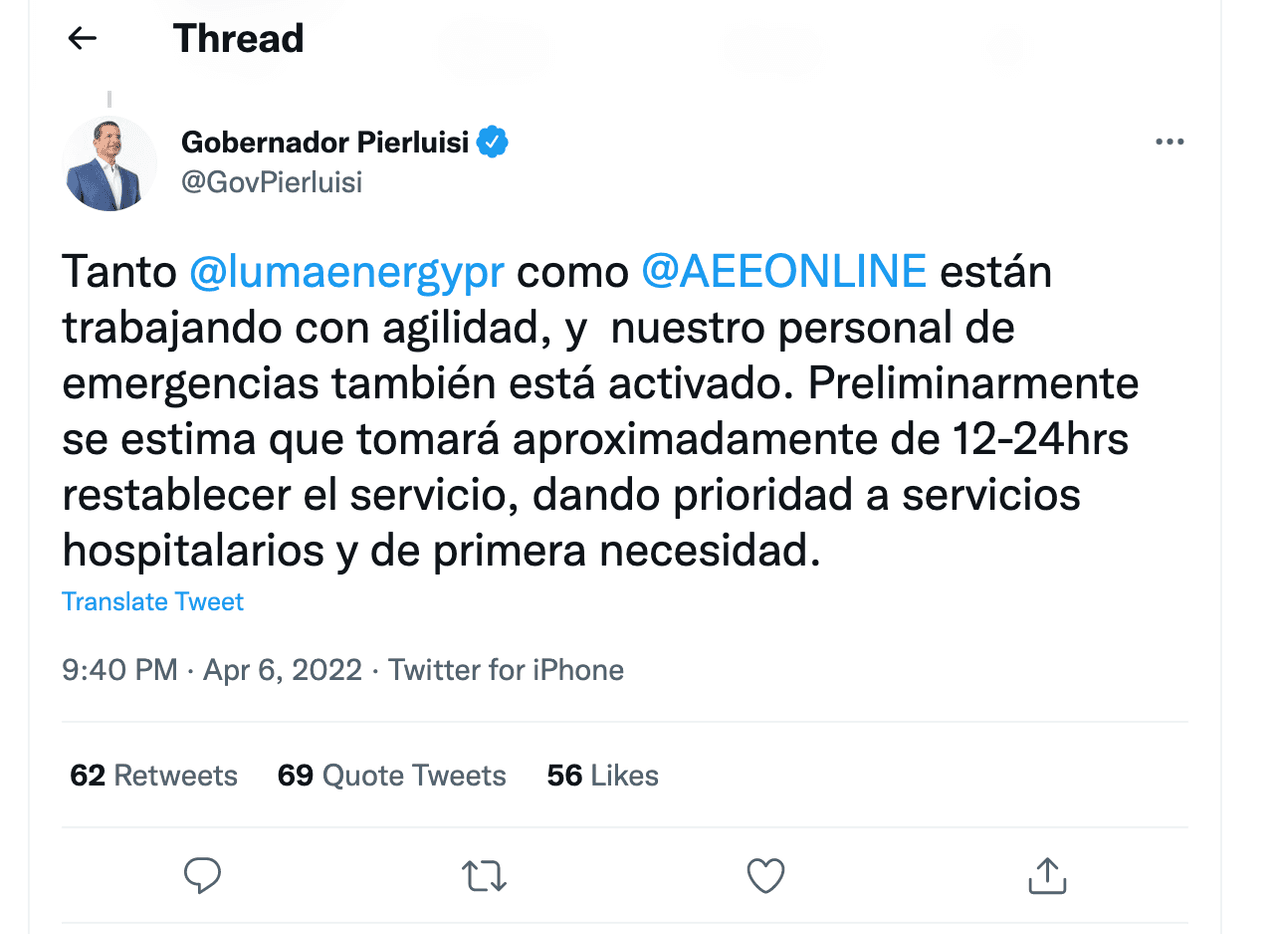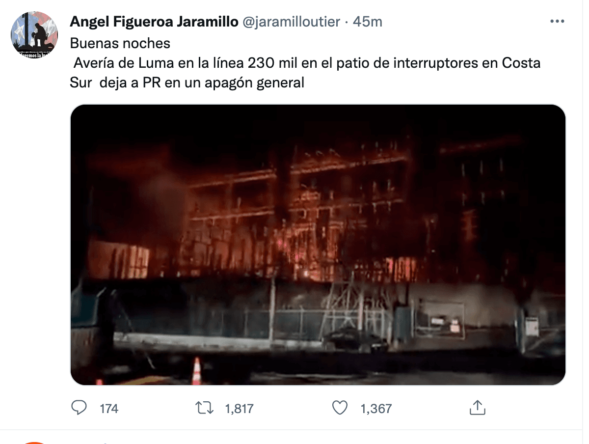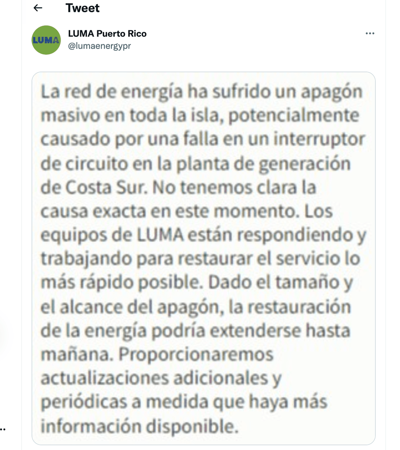 El consorcio Luma Energy, que precisamente este mes impuso un sexto aumento en el costo del servicio de energía eléctrica, ofreció la razón oficial sobre lo que está ocurriendo, casi dos horas después de reportado el incidente.