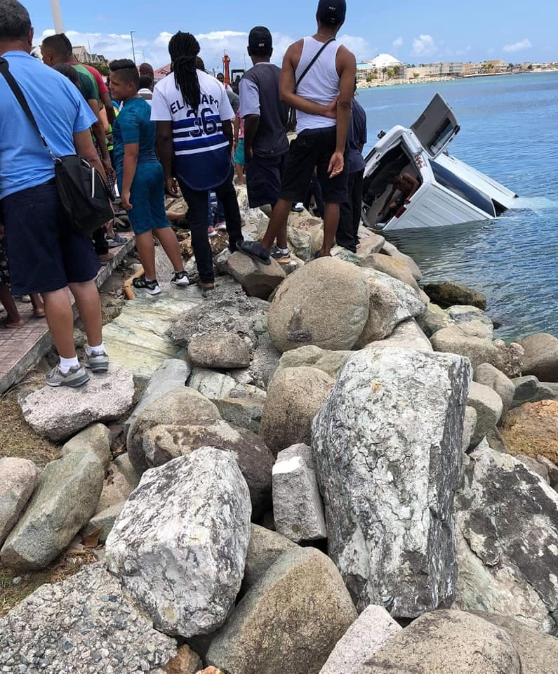 Fotos publicadas en la página Cruceros Puerto Rico en Facebook muestran como una guagua van cayó al agua.