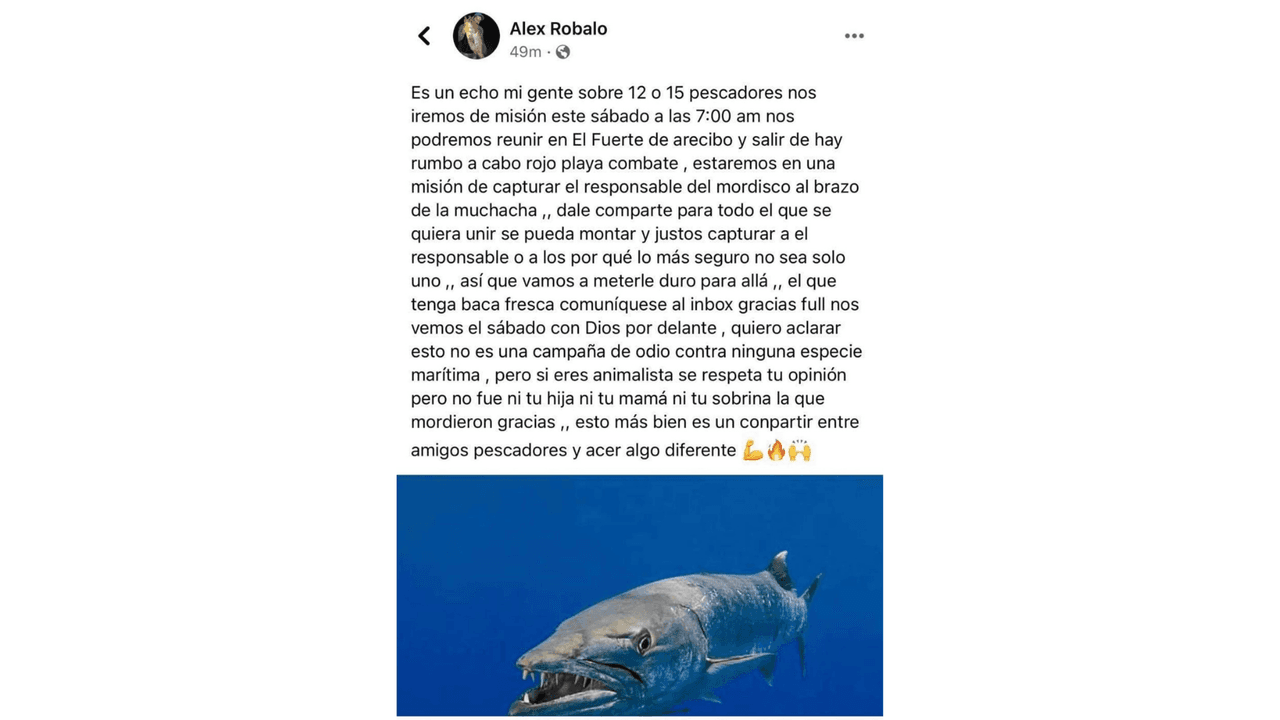 En redes sociales, se difundió una foto un pescador que identifica en Facebook como Alex Robalo, quien publicó que un grupo de pescadores partiría desde Arecibo hasta Cabo Rojo para comenzar la cacería del pez que mordió a la joven.