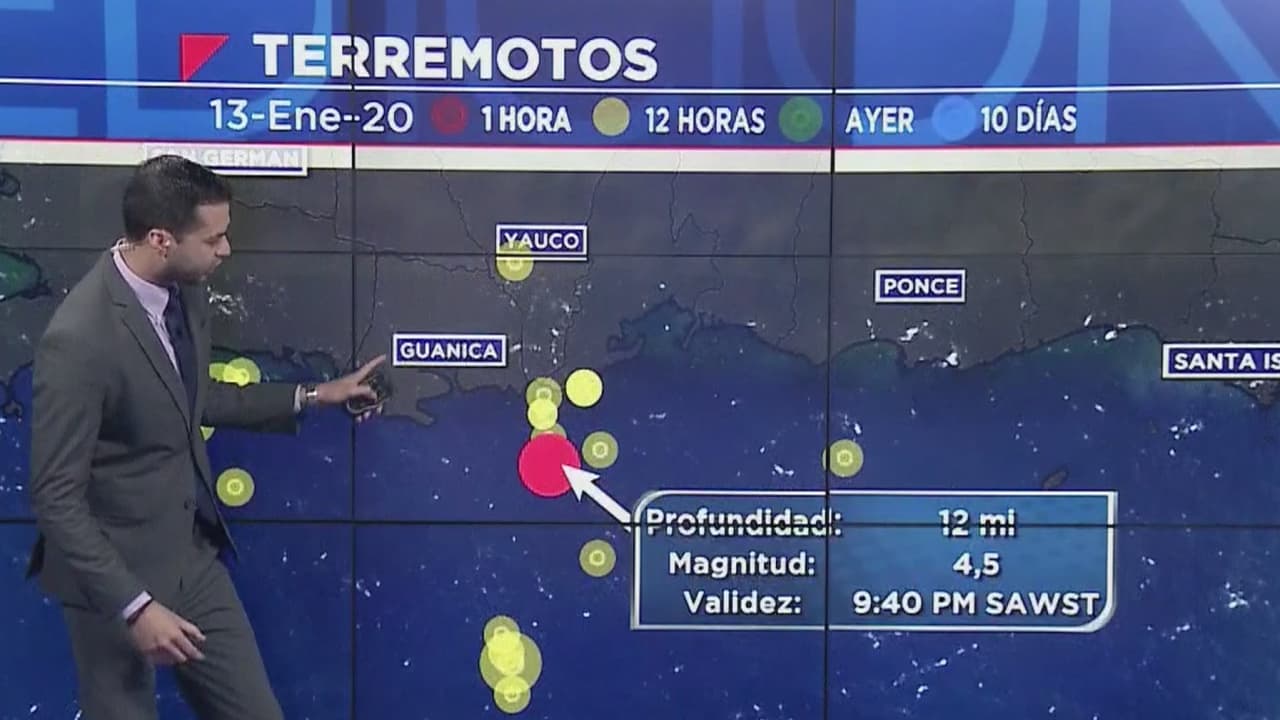 El último sismo se registró este lunes a las 9:40 de la noche con una magnitud de 4.5 y pudo sentirse en las zonas de Guánica, Guayanilla y Peñuelas, mientras para este martes se esperan lluvias en el centro de la isla. Tome sus precauciones.