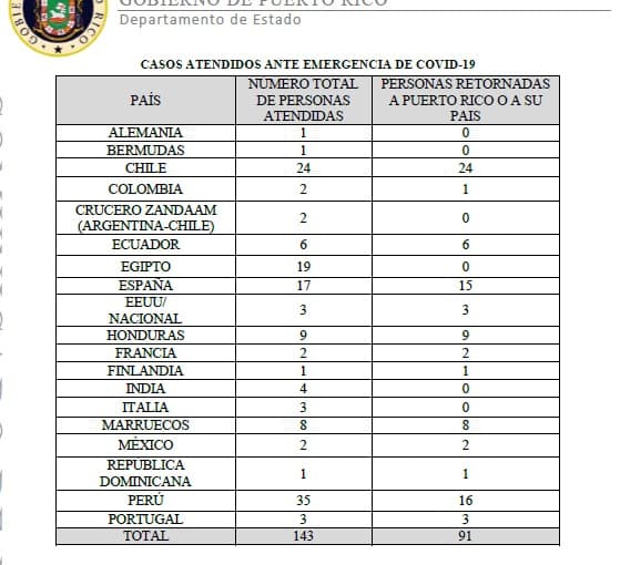 “Nos enfrentamos a una situación atípica con la pandemia del covid-19 puesto que la mayoría de los países han cerrado sus fronteras y aeropuertos. Para el manejo de todos los casos recibidos, hemos creado un trabajo conjunto con la oficina de la Comisionada Residente de Puerto Rico en Washington, Jenniffer González, quien ya ha enviado varias comunicaciones al secretario de Estado del Departamento de Estado Federal, Mike Pompeo, donde notifica el detalle de los puertorriqueños que se encuentran en otros países y haciendo un reclamo de prioridad a la situación de estos ciudadanos”, detalló el secretario de Estado, Elmer L. Román González.