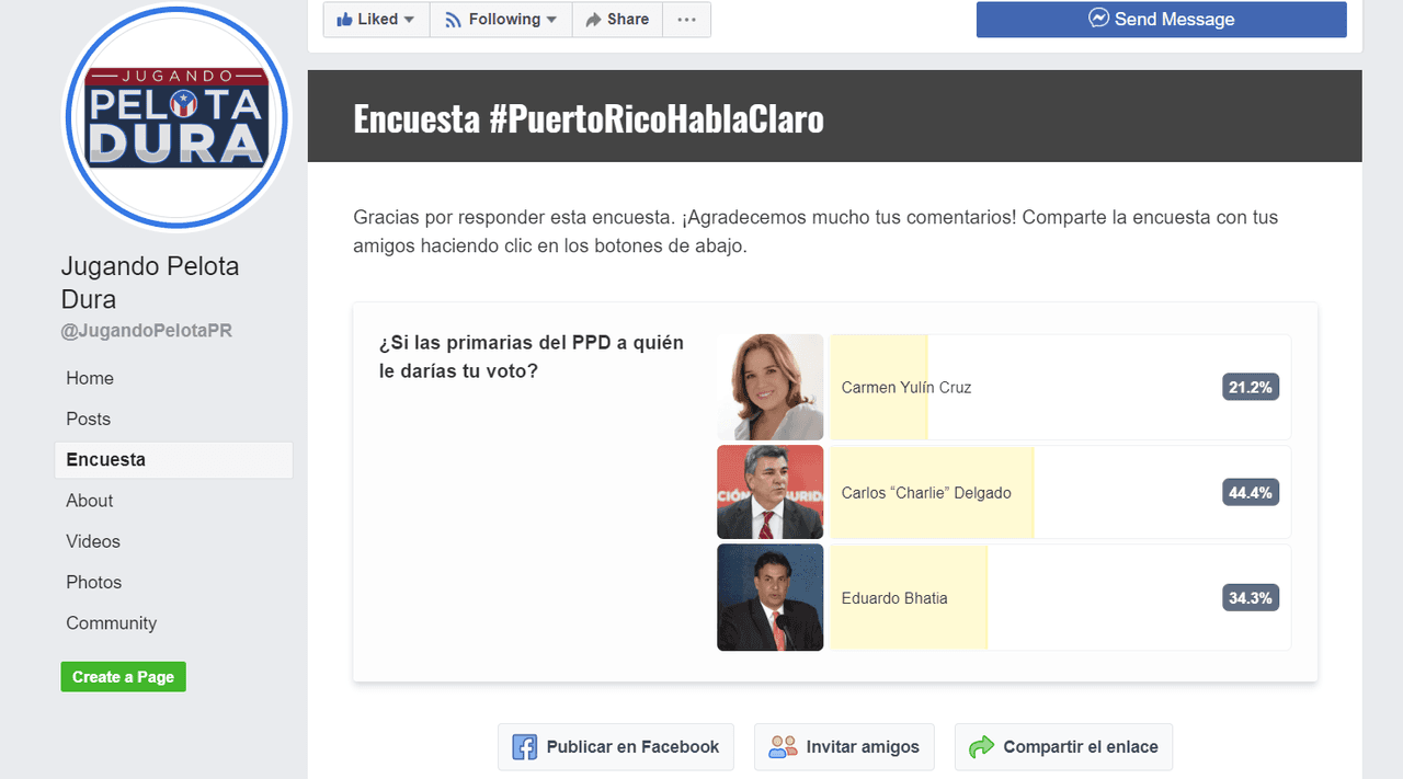 Aunque la encuesta carece de detalles, ya que solo pregunta quién sería el candidato del PPD que correría en las elecciones de noviembre , las personas encuestadas en el programa televisivo de Univision, Jugando Pelota Dura, votaron en un 34.3% por Bhatia y un 21.2% por la alcaldesa de la capital.