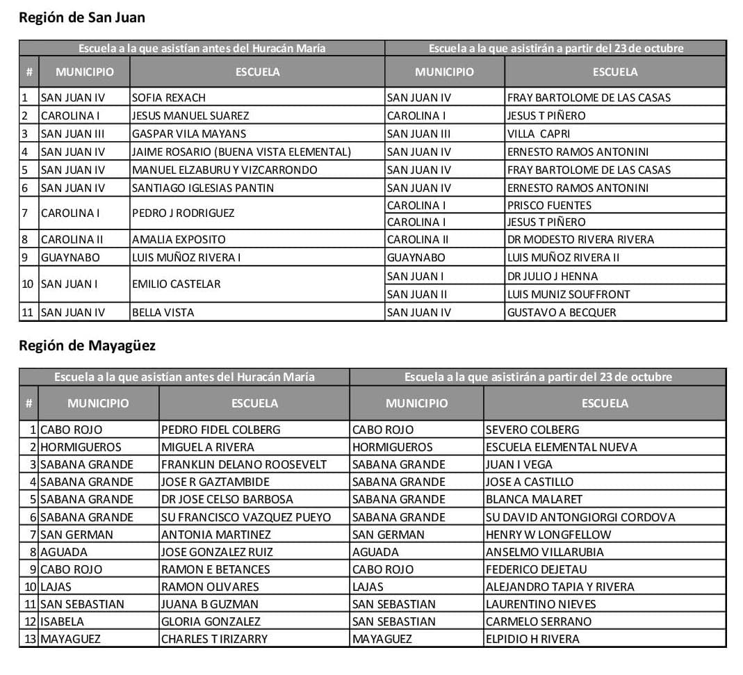 En la región de San Juan estudiantes de 11 escuelas que no pudieron abrir fueron reubicados a 11 escuelas abiertas y en Mayagüez estudiantes de 13 escuelas fueron reubicados en 13 planteles distintos.