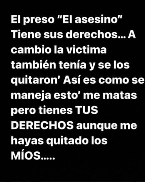En otra publicación la hermana escribió: “El preso, ‘El asesino’, tiene sus derechos... A cambio, la víctima también tenía y se los quitaron. Así es como se maneja esto, me matas pero tienes tus derechos aunque me hayas quitado los míos”.