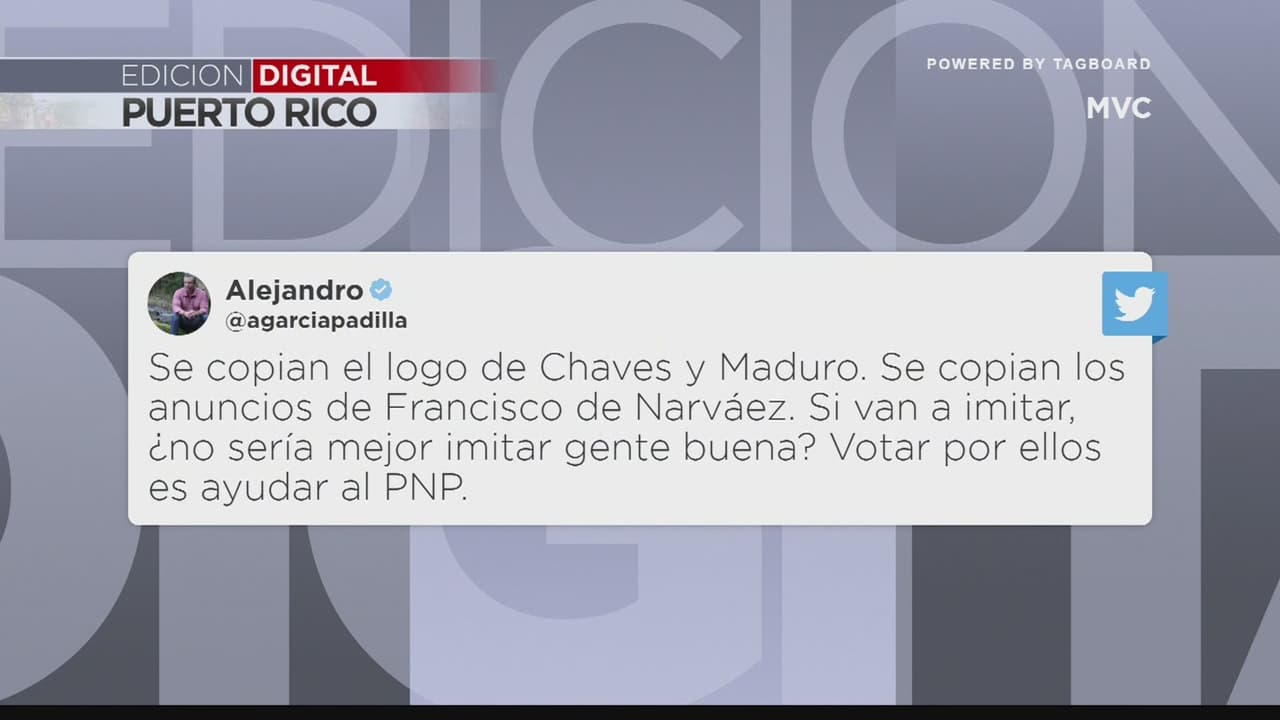 “Se copian el logo de Chaves y Maduro. Se copian los anuncios de Francisco de Narváez. Si van a imitar, ¿no sería mejor imitar gente buena? Votar por ellos es ayudar al PNP”, dijo García Padilla en su tuit.
