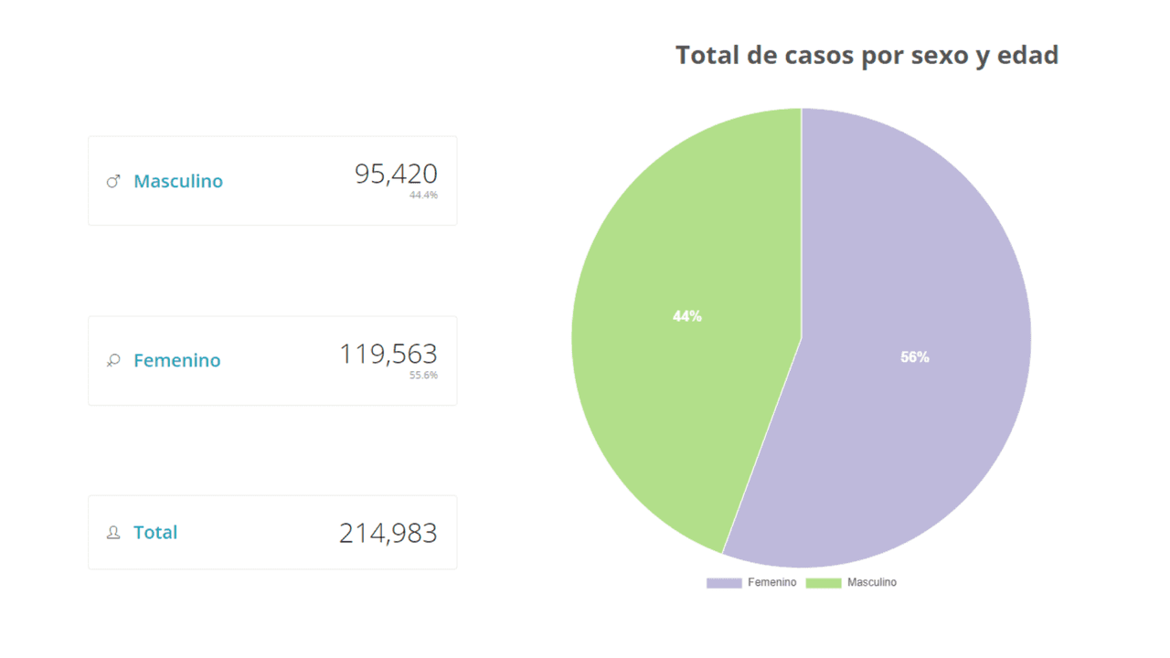 Respecto de los contagios por edad y sexo, en Puerto Rico las mujeres son las que más se infectan de coronavirus con un 55.6% contra un 44.4% de hombres.