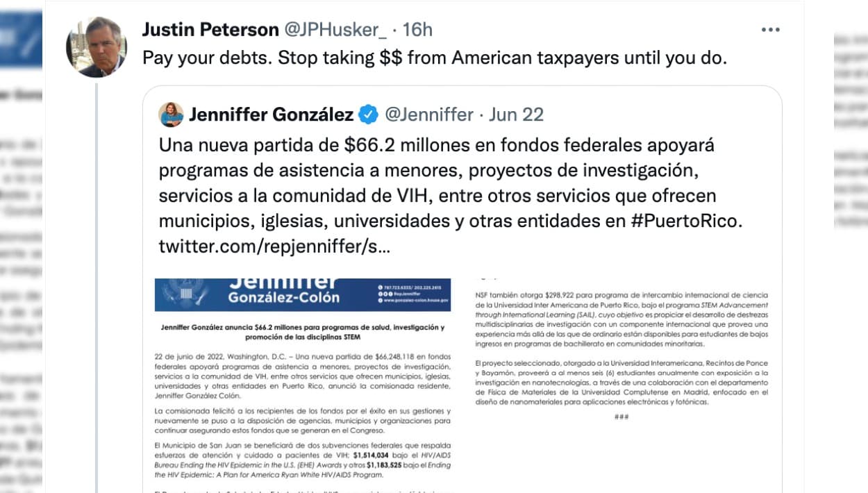 Peterson, quien fue nombrado a la Junta en octubre de 2020 por el entonces presidente Donald Trump, respondió a un tuit de la comisionada Jenniffer González diciendo: “ Paga tus deudas. Deja de estar cogiendo $$ de los contribuyentes americanos, hasta que lo hagas”.