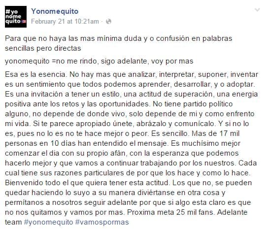 Yo No Me Quito es el nombre de un movimiento que surgió a principios de febrero y que ha acaparado las redes sociales, los billboards y otros espacios de expresión pública identificado con el hashtag (etiqueta) #YoNoMeQuito que, de inmediato, de volvió viral.