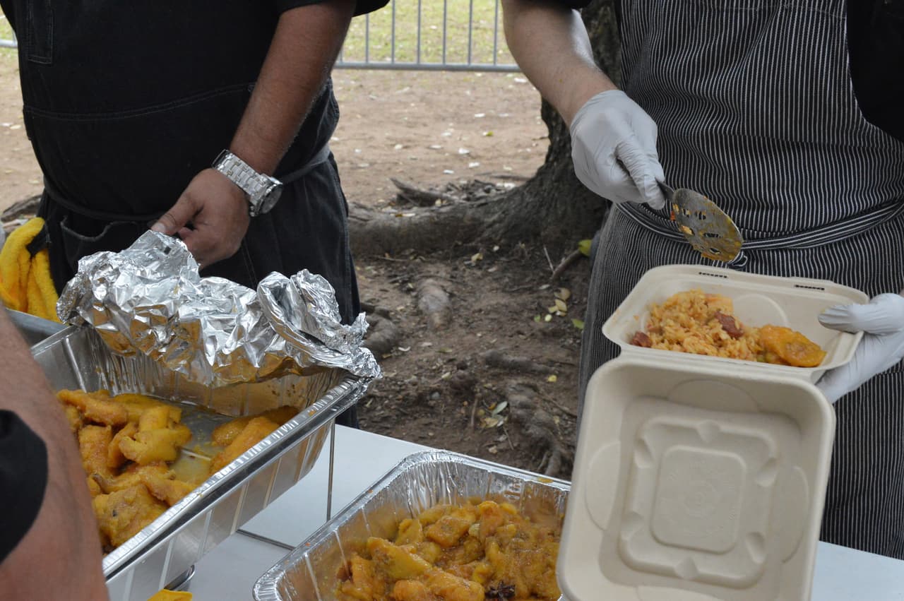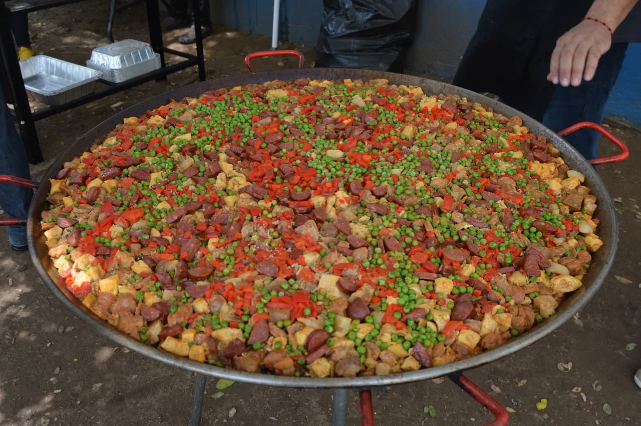 Desde temprano en la mañana las paelleras están cocinando almuerzos para quienes lo necesiten y cientos de personas llegaron a buscar su plato caliente en un ambiente de mucha organización y demostraciones de trabajo en equipo y solidaridad.