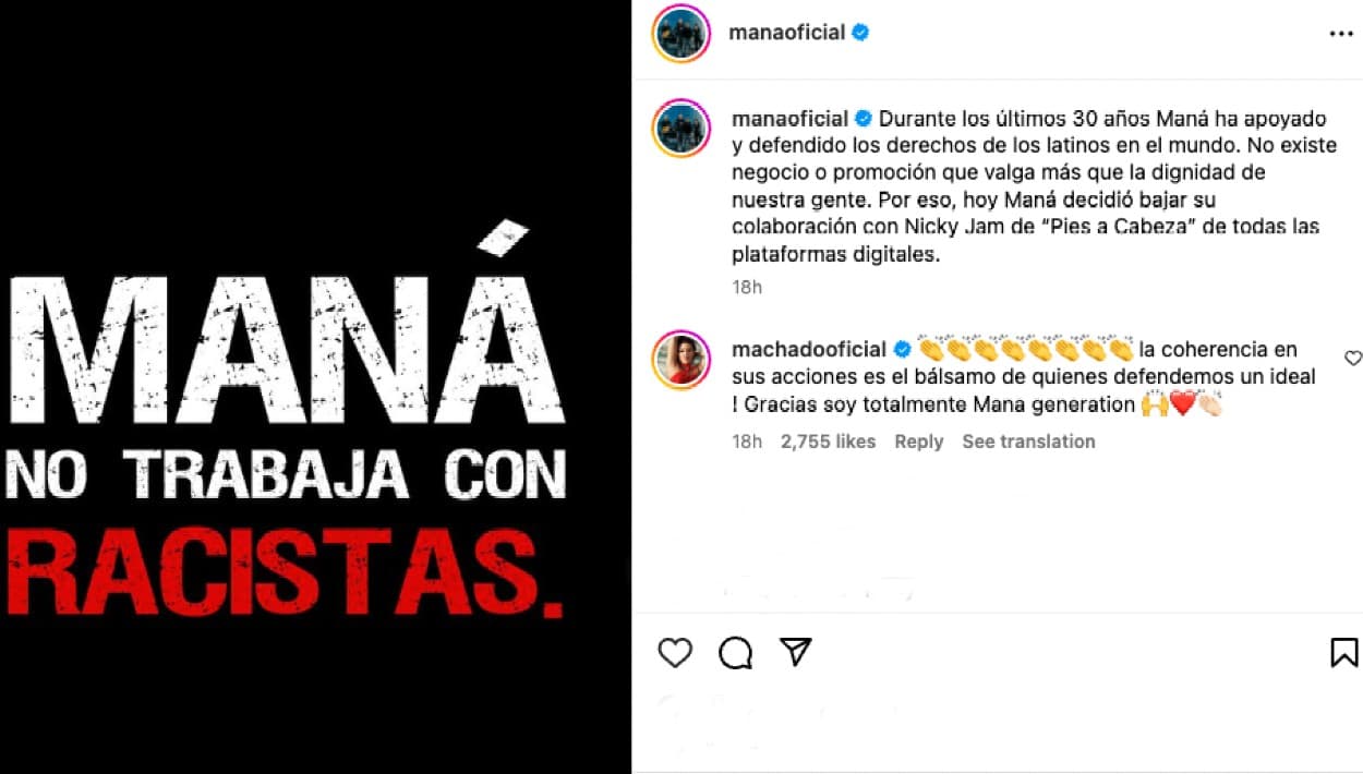 Por si a alguien le quedaba alguna duda, al lado, escribieron claramente a qué se referían: "Durante los últimos 30 años Maná ha apoyado y defendido los derechos de los latinos en el mundo. No existe negocio o promoción que valga más que la dignidad de nuestra gente. Por eso, hoy Maná decidió bajar su colaboración con Nicky Jam 'De pies a cabeza' de todas las plataformas digitales".
