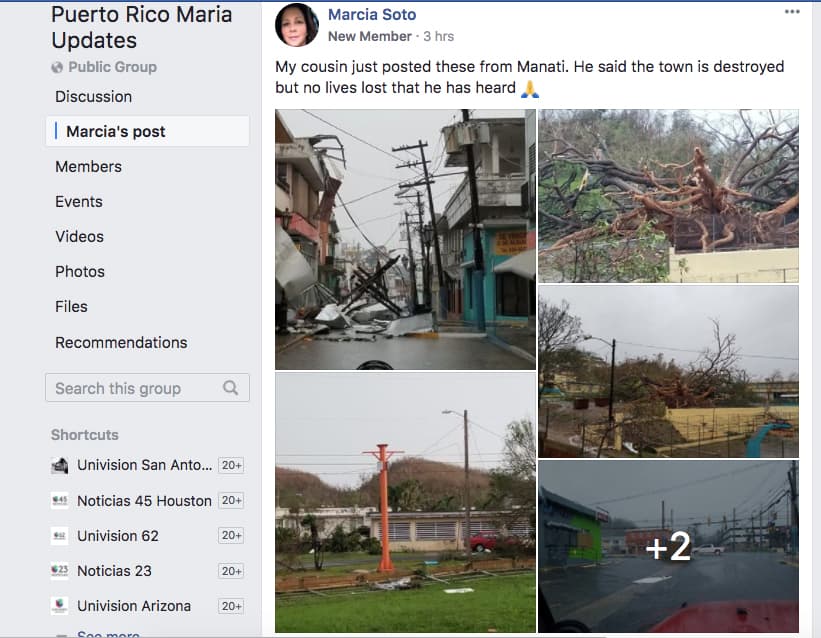 En la página de Facebook de un grupo creado para publicar actualizaciones relacionadas con el paso del huracán María por la isla, la usuaria Marcia Soto publicó varias imágenes de los daños ocurridos en el municipio. En su post explicó que las fotos se las envió un familiar que vive en lugar, quien además le dijo que no tiene información de víctimas mortales, aunque el pueblo está "destruido".