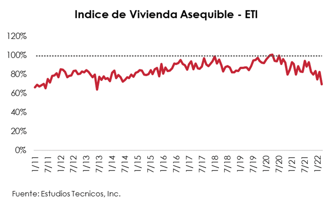 Estudios Técnicos, Inc. (ETI) informó hoy que el Índice de Vivienda Asequible bajó en marzo de este año a 69% debido a la merma en el ingreso familiar ante la inflación y el alza en precios de las viviendas, lo que representa una reducción de 31 puntos desde marzo de 2020.