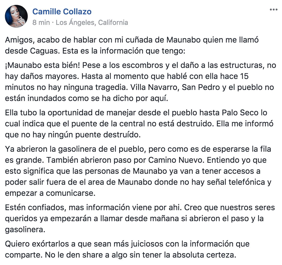 Camille Collazo comentó en el grupo de Facebook que habló con su cuñada en la zona y que no había "daños mayores".