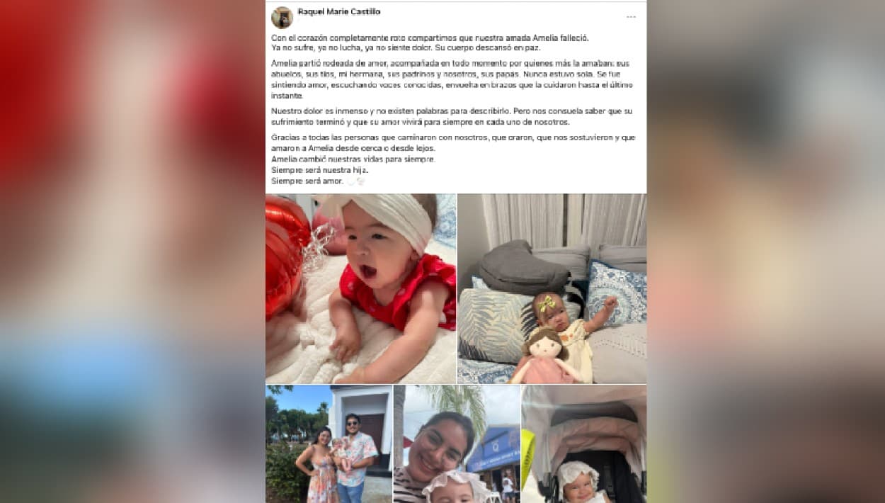 Al amanecer del lunes, su madre publicó en Facebook el siguiente mensaje: "Con el corazón completamente roto compartimos que nuestra amada Amelia falleció.Ya no sufre, ya no lucha, ya no siente dolor. Su cuerpo descansó en paz. Amelia partió rodeada de amor, acompañada en todo momento por quienes más la amaban: sus abuelos, sus tíos, mi hermana, sus padrinos y nosotros, sus papás. Nunca estuvo sola. Se fue sintiendo amor, escuchando voces conocidas, envuelta en brazos que la cuidaron hasta el último instante".