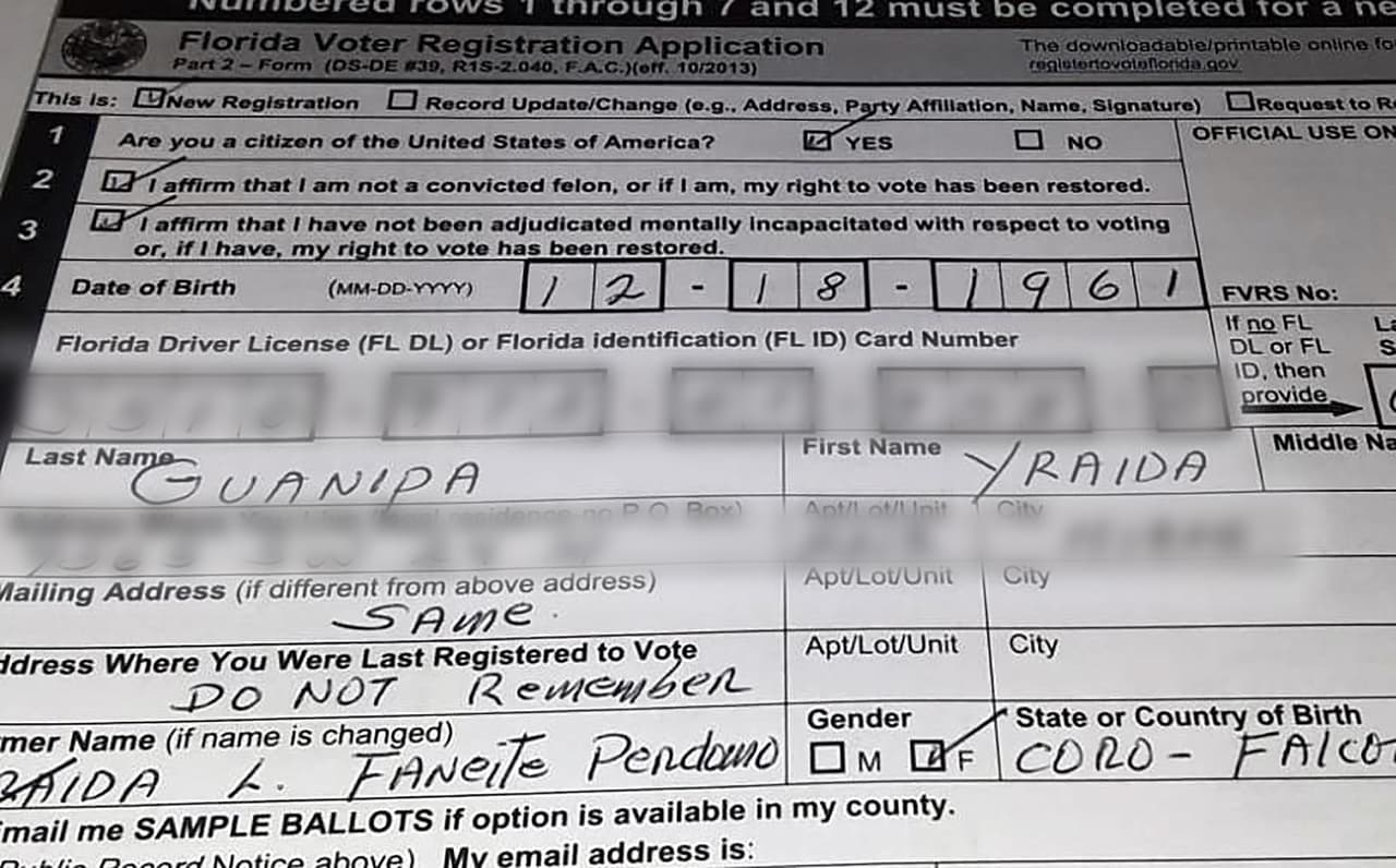 Después de presentar un documento de registro de votantes, Guanipa dijo que la avisaron que recibiría un aviso de aprobación en 24 o 48 horas. En el documento Guanipa solo tuvo que afirmar que, aunque es una criminal convicta, "mi derecho de voto ha sido restablecido."