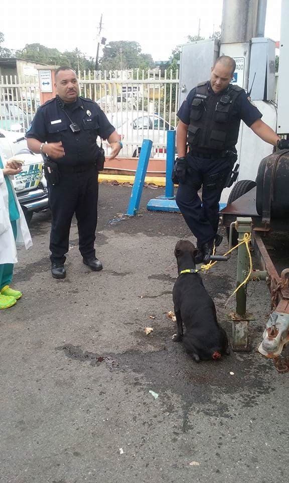 Una perra de la raza pit bull a la que le arrancaron la cola y parte del lomo buscó socorro en el cuartel de la Policía Municipal de Toa Alta, en Puerto Rico donde fue asistida junto a personal de un Centro de Salud.