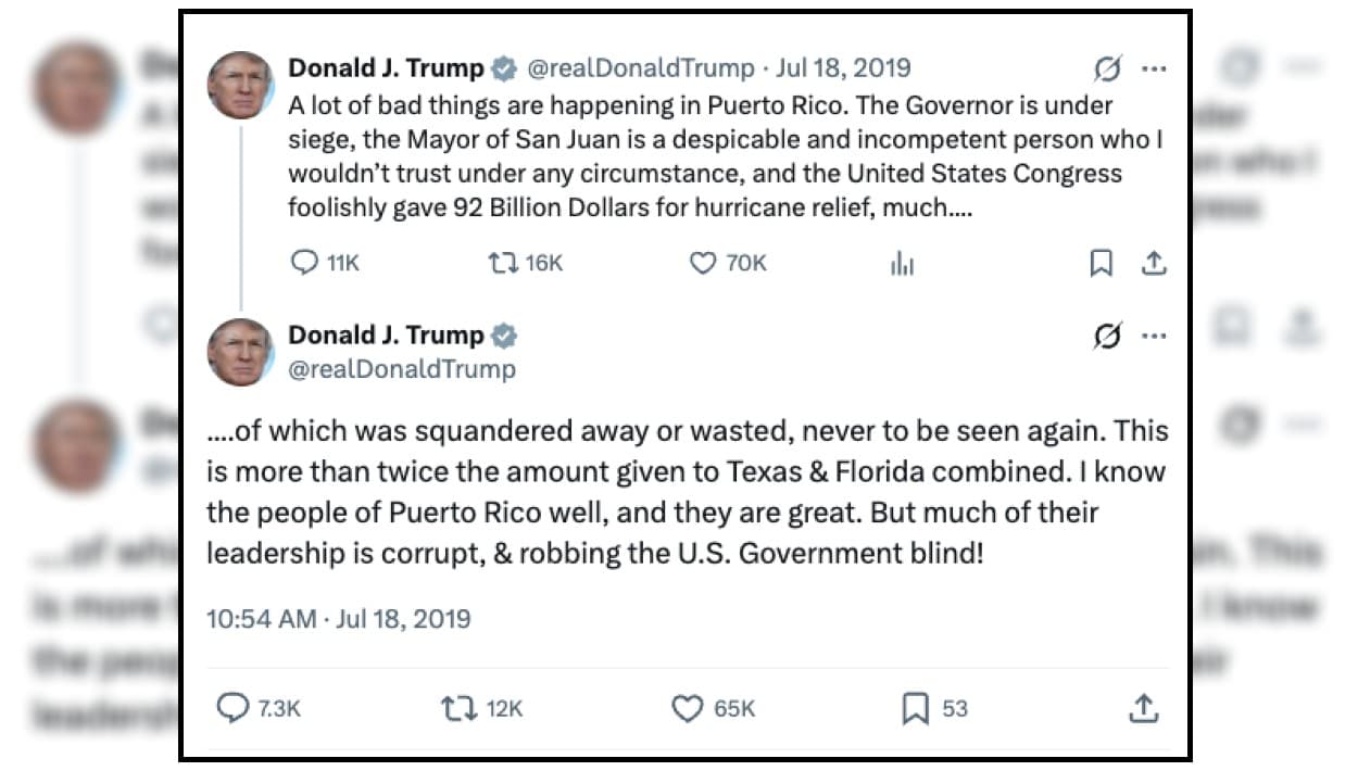 Un día después de la mayor manifestación de pueblo en la isla, el presidente republicano expresó, en dos 'trinos' (arriba), lo siguiente: "Están sucediendo muchas cosas malas en Puerto Rico. El gobernador está bajo asedio, la alcaldesa de San Juan es una persona despreciable e incompetente en quien no confiaría bajo ninguna circunstancia, y el Congreso de los Estados Unidos, tontamente, dio 92 mil millones de dólares para ayuda por el huracán (María), muchos de los cuales se malgastaron o se desperdiciaron, para nunca volver a verse. Esto es más del doble de la cantidad donada a Texas y Florida juntos. Conozco bien a la gente de Puerto Rico, y son maravillosos. Pero gran parte de su liderazgo es corrupto y está robando al gobierno de Estados Unidos a ciegas".