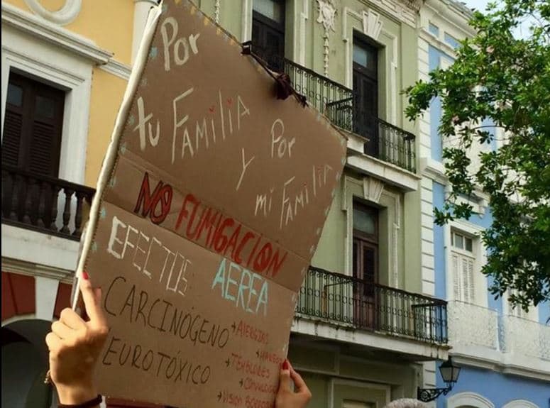La manifestación del "Frente Unido en Contra de la Fumigación Aérea" tuvo lugar cerca La Fortaleza, sede del Ejecutivo y residencia del gobernador, Alejandro García Padilla, para reclamarle al mandatario de que desista de sus planes de fumigar con ese el químico organofosforado algunas de las áreas más pobladas de la isla.