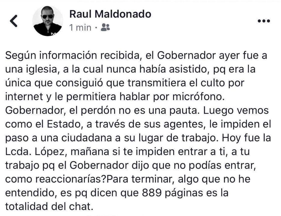 "Según información recibida, el gobernador ayer fue a una iglesia, a la cual nunca había asistido, pq era la única que consiguió que transmitiera el culto por internet y le permitiera hablar por micrófono", señala Maldonado en Facebook.