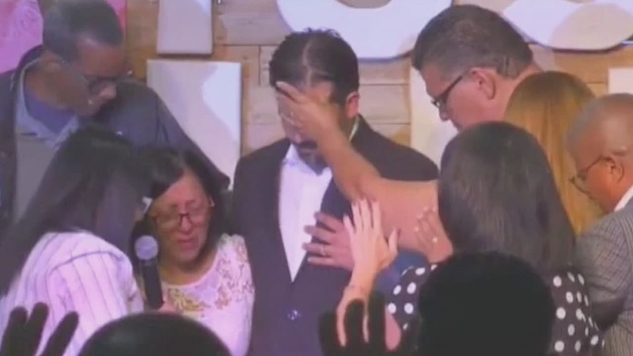 El gobernador de Puerto Rico visitó la iglesia donde los feligreses le dieron palabras de aliento e incluso impusieron sus manos para orar por él.