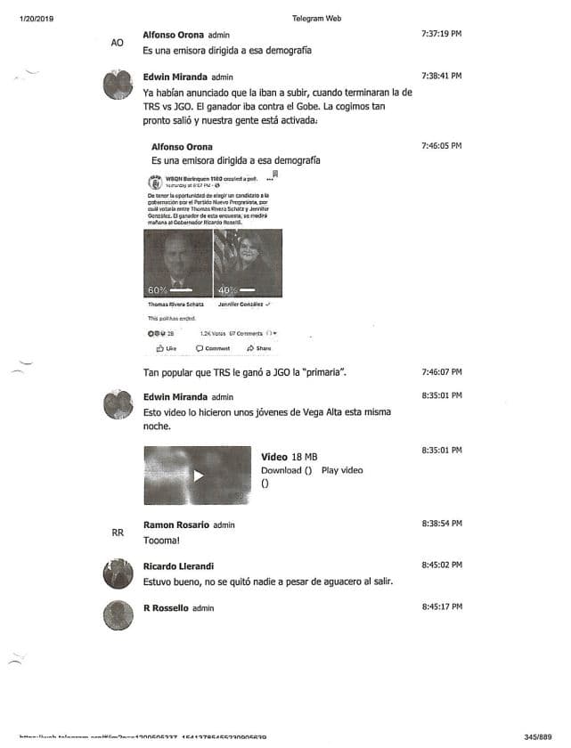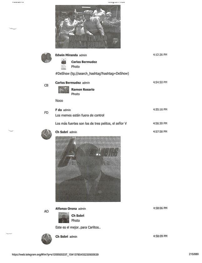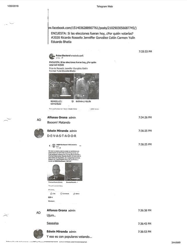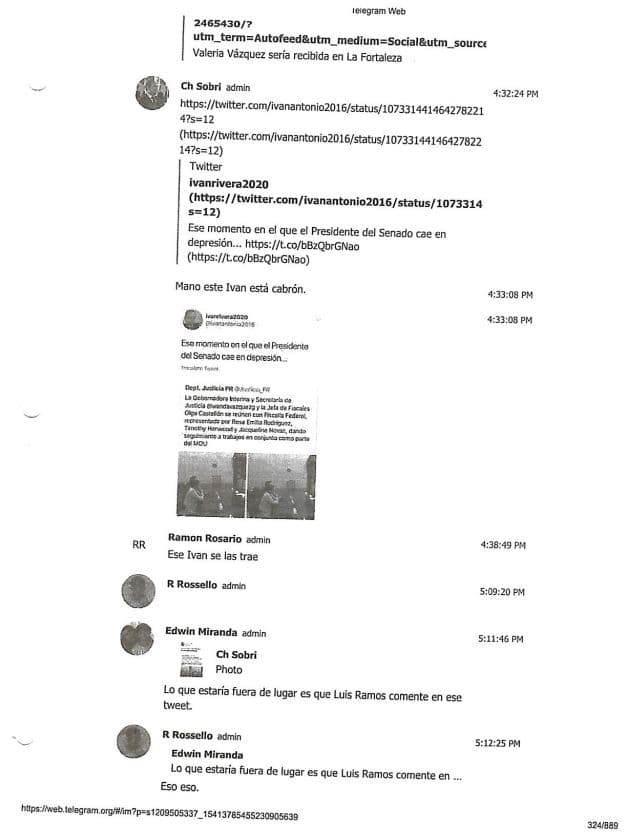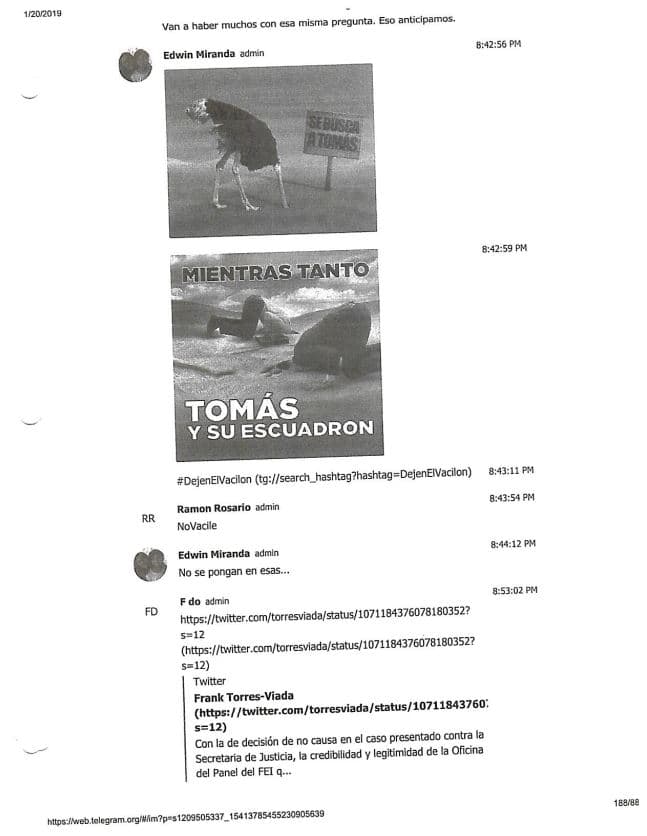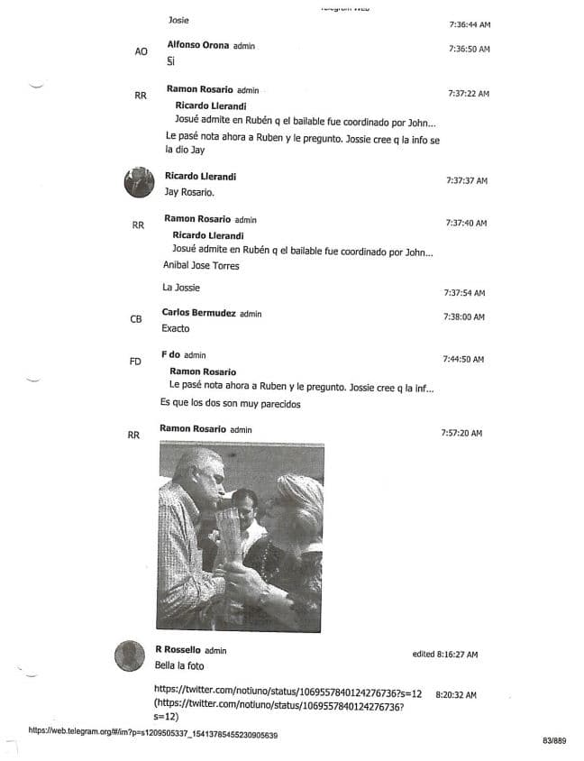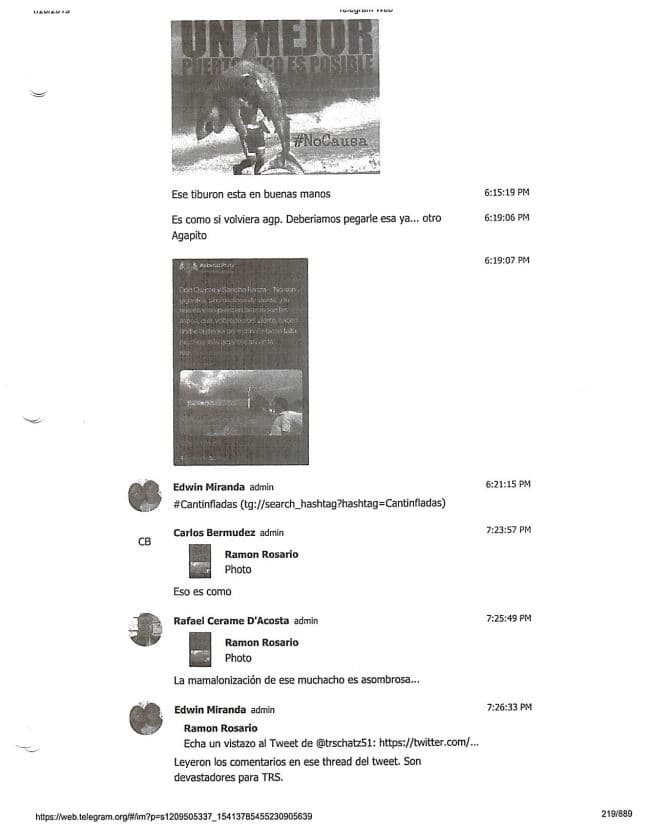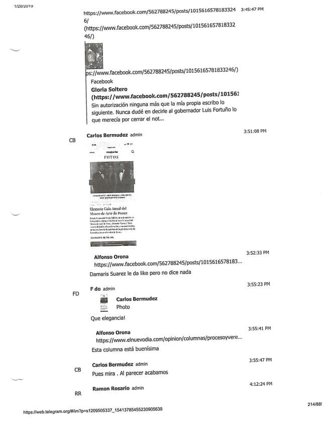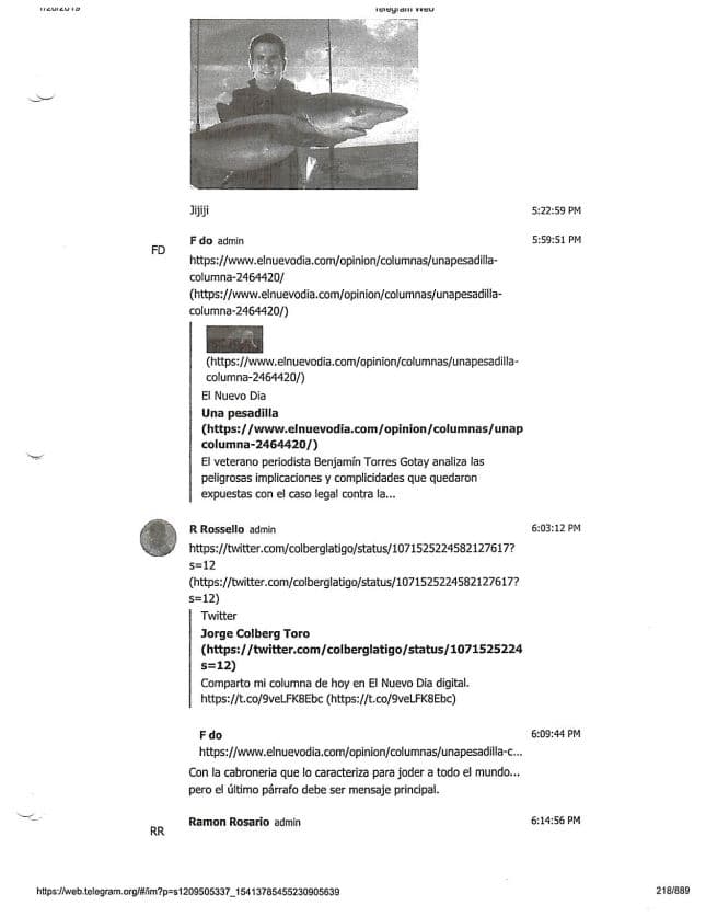 El pliego precisa que para el 1 de febrero de 2019 la Persona 1, contactó a Díaz Colón y el 3 de febrero se reunió con él en su apartamento. En eso, la Persona 1 le indicó a Díaz Colón que tenía en su poder copia de los mensajes de Telegram que la Persona 1 entendía que contenía información incriminatoria sobre la Persona 3 y otros oficiales públicos.