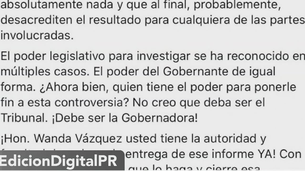 A través de su cuenta de Facebook el presidente del Senado, Thomas Rivera Schatz, pidió a la gobernadora, Wanda Vázquez, poner el fin a la situación; ya que ella es quien tiene la facultad de ordenar la entrega de dicho informe.