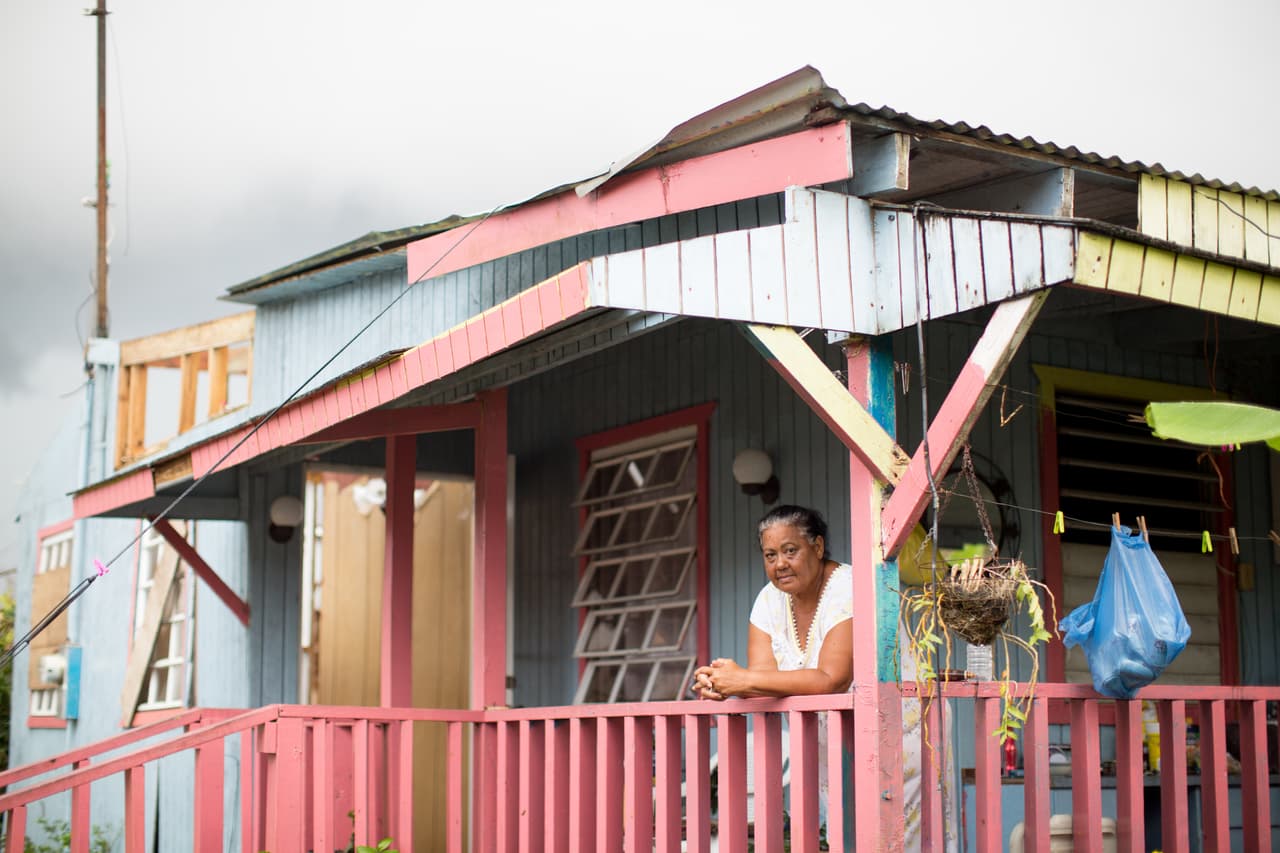 Carmen Ríos, de 64 años, quedó confinada prácticamente a su cuarto y a un minúsculo patio lateral. El huracán María voló casi todo el techo de la casa de madera en Maguayo, municipio Dorado. Se llevó el del baño, el de la cocina –incluso con los gabinetes–, el del cuarto de su nieto, el del pasillo central. Lo único que quedó sujeto a las vigas de madera del techo, fueron dos lámparas. A pesar del destrozo ella asegura que se queda en su casa. Cuando cae la noche cierra la puerta plástica corrediza de su cuarto y se encomienda a dios. Vive sola.