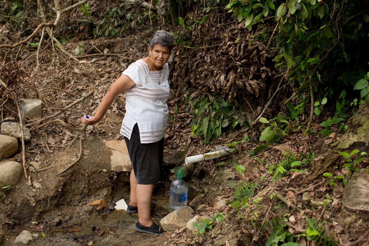 Eliana Rodríguez es una mujer ágil a pesar de sus 82 años. No tiene agua ni luz desde que el huracán Irma pasó por la isla, hace un mes. Aún así resuelve. Cada mañana a las 6:00 am se levanta y camina los 15 minutos que hay desde su casa en Santa Juanita, en el municipio Bayamón, hasta el manantial de la familia y se trae sus dos botellones de agua a cuestas. Esa es la que se bebe, ninguna otra. También es con la que prepara sus comidas y le hace café al vecino de al lado, en agradecimiento porque le da luz con una planta generadora.