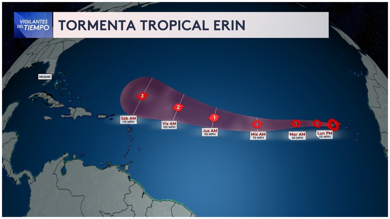 La tormenta tropical Erin avanza rápidamente en el Atlántico tropical y, según el Centro Nacional de Huracanes, podría fortalecerse a huracán para el jueves, aproximándose a Puerto Rico y las Islas de Sotavento del norte durante el fin de semana.