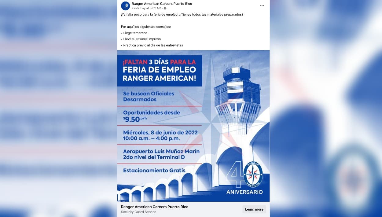 Este miércoles, la empresa Ranger American realizará una feria de empleo en el Terminal D del aeropuerto internacional de Isla Verde, en Carolina, para reclutar guardias de seguridad desarmados, con o sin experiencia. Quienes no puedan llegar, pueden solicitar en línea.