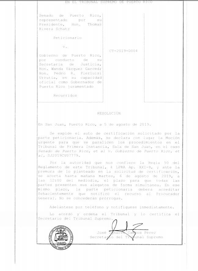 El Tribunal Supremo de Puerto Rico aceptó la solicitud del Senado para tomar jurisdicción en la demanda impuesta por el presidente de ese cuerpo Thomas Rivera Schatz.