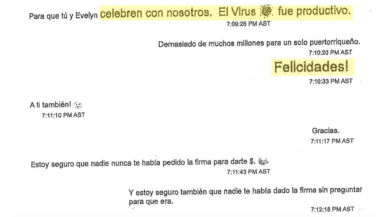 -“Demasiados millones para un solo puertorriqueño”, contestó en otro mensaje de texto Rodríguez López.