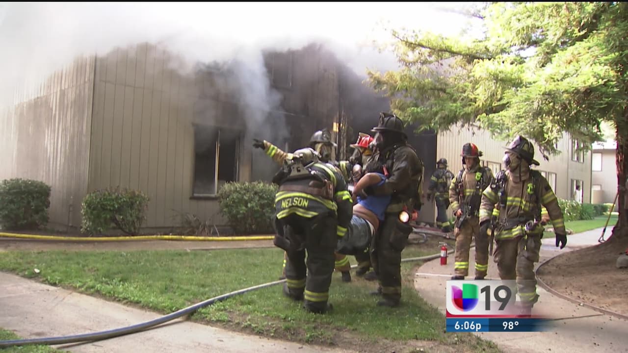En medio de un incendio que consumía un complejo de apartamentos en Sacramento, bomberos rescataron a una mujer de una de las viviendas en llamas.