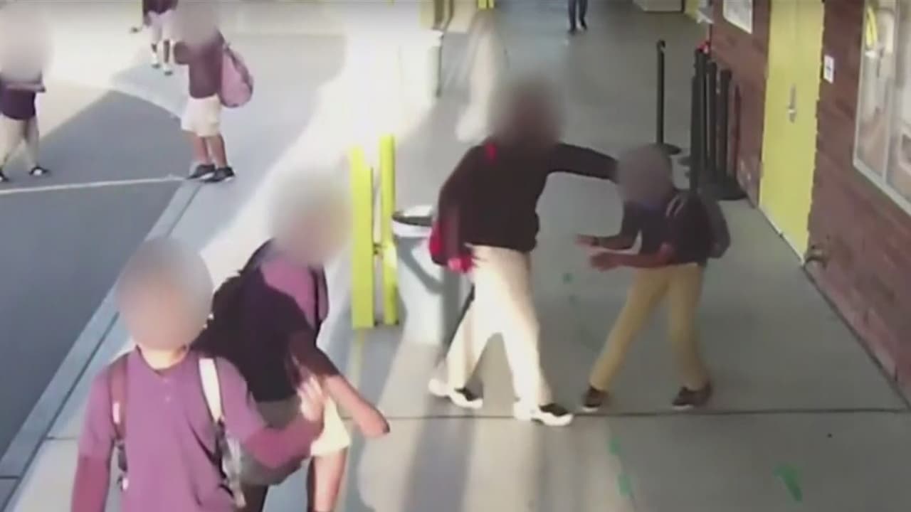 El incidente que tuvo lugar en la Escuela Intermedia Animo Westside, localizada en el 5456 McConnell Ave, Los Angeles, CA 90066 en enero de 2018, muestra al niño siendo empujado y golpeado por un alumno de octavo grado mientras otros dos lo acorrallaban.