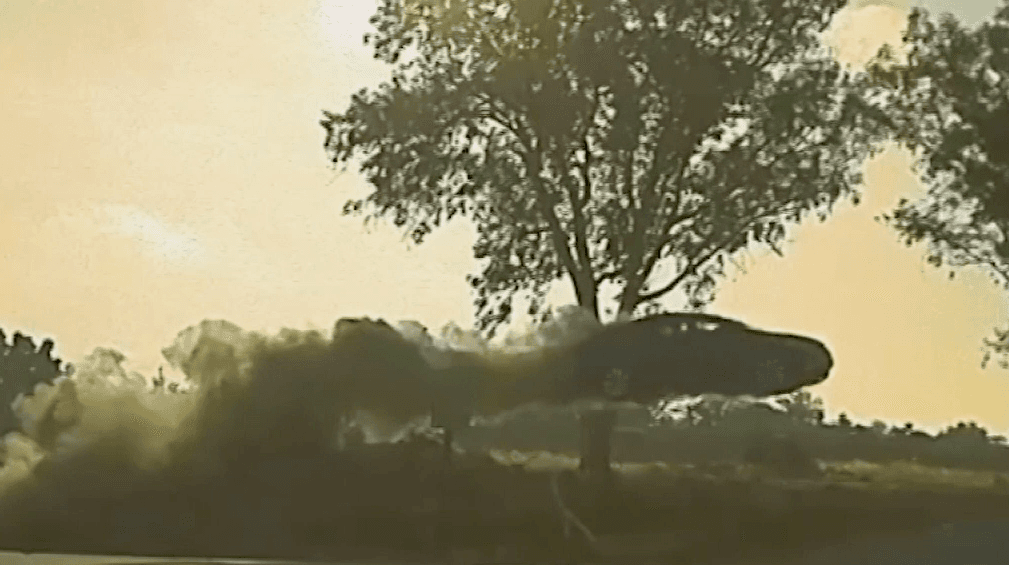 En el video se observa cómo el auto pasa a pocos pies de distancia de un árbol y un poste cuando está en el aire.