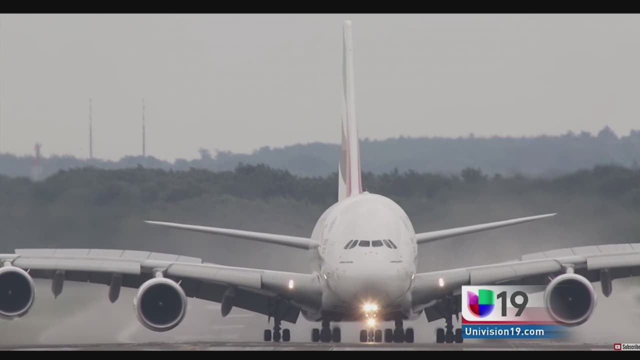 El avión comercial más grande del mundo tuvo que realizar un arriesgado aterrizaje en el aeropuerto de Düsseldorf, Alemania, entre vientos cruzados y la pista completamente mojada.