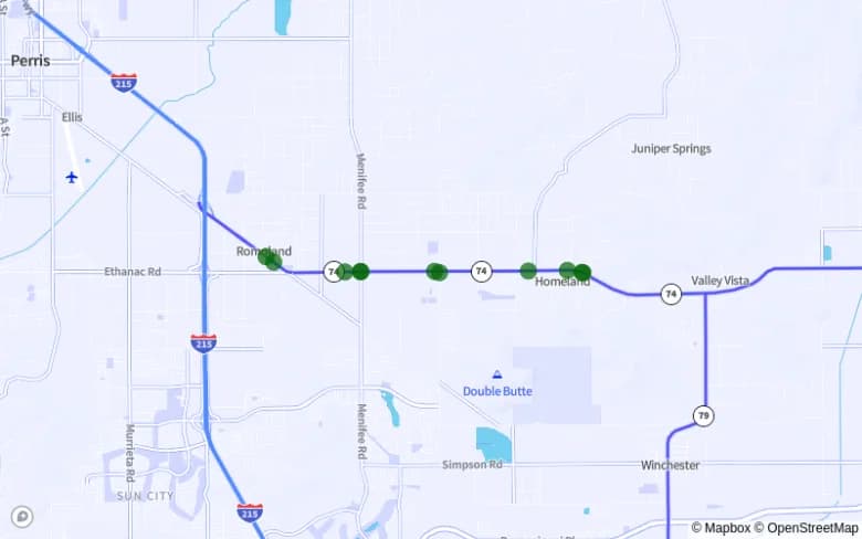- 6. Menifee. SR-74 entre Melba Avenue and 3RD ST, con 11 accidentes y 12 víctimas.